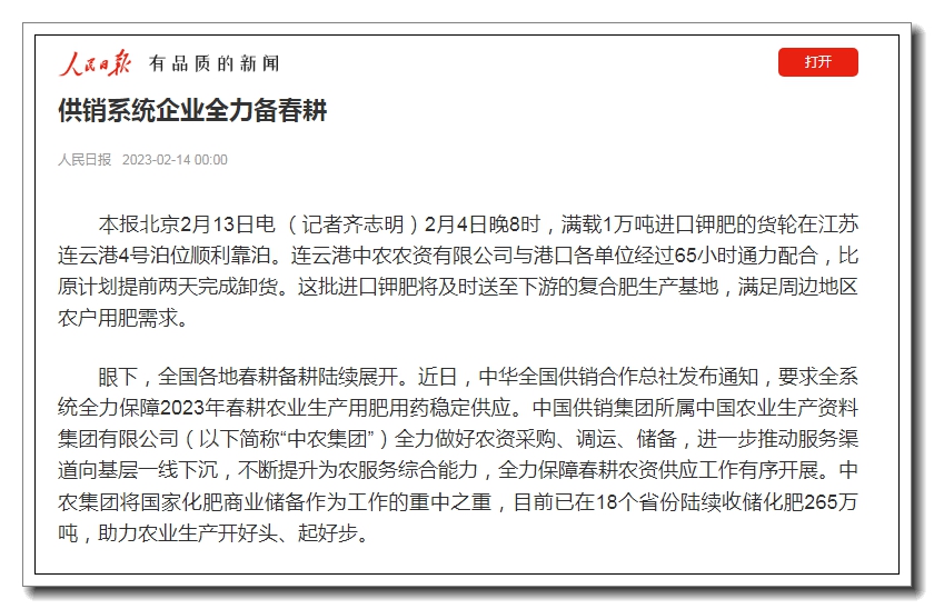 眼下,全國各地春耕備耕陸續(xù)展開。近日,中華全國供銷合作總社發(fā)布通知,要求全系統(tǒng)全力保障2023年春耕農(nóng)業(yè)生產(chǎn)用肥用藥穩(wěn)定供應。中國供銷集團所屬中國農(nóng)業(yè)生產(chǎn)資料集團有限公司(以下簡稱“中農(nóng)集團”)全力做好農(nóng)資采購、調(diào)運、儲備,進一步推動服務渠道向基層一線下沉,不斷提升為農(nóng)服務綜合能力,全力保障春耕農(nóng)資供應工作有序開展。中農(nóng)集團將國家化肥商業(yè)儲備作為工作的重中之重,目前已在18個省份陸續(xù)收儲化肥265萬噸,助力農(nóng)業(yè)生產(chǎn)開好頭、起好步。